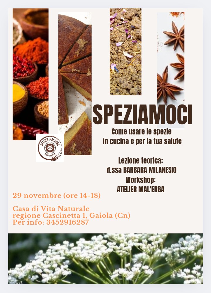 - 14,00 – 16,00 le Spezie per la nostra salute con Barbara Milanesio: come usare questi doni per favorire il benessere
